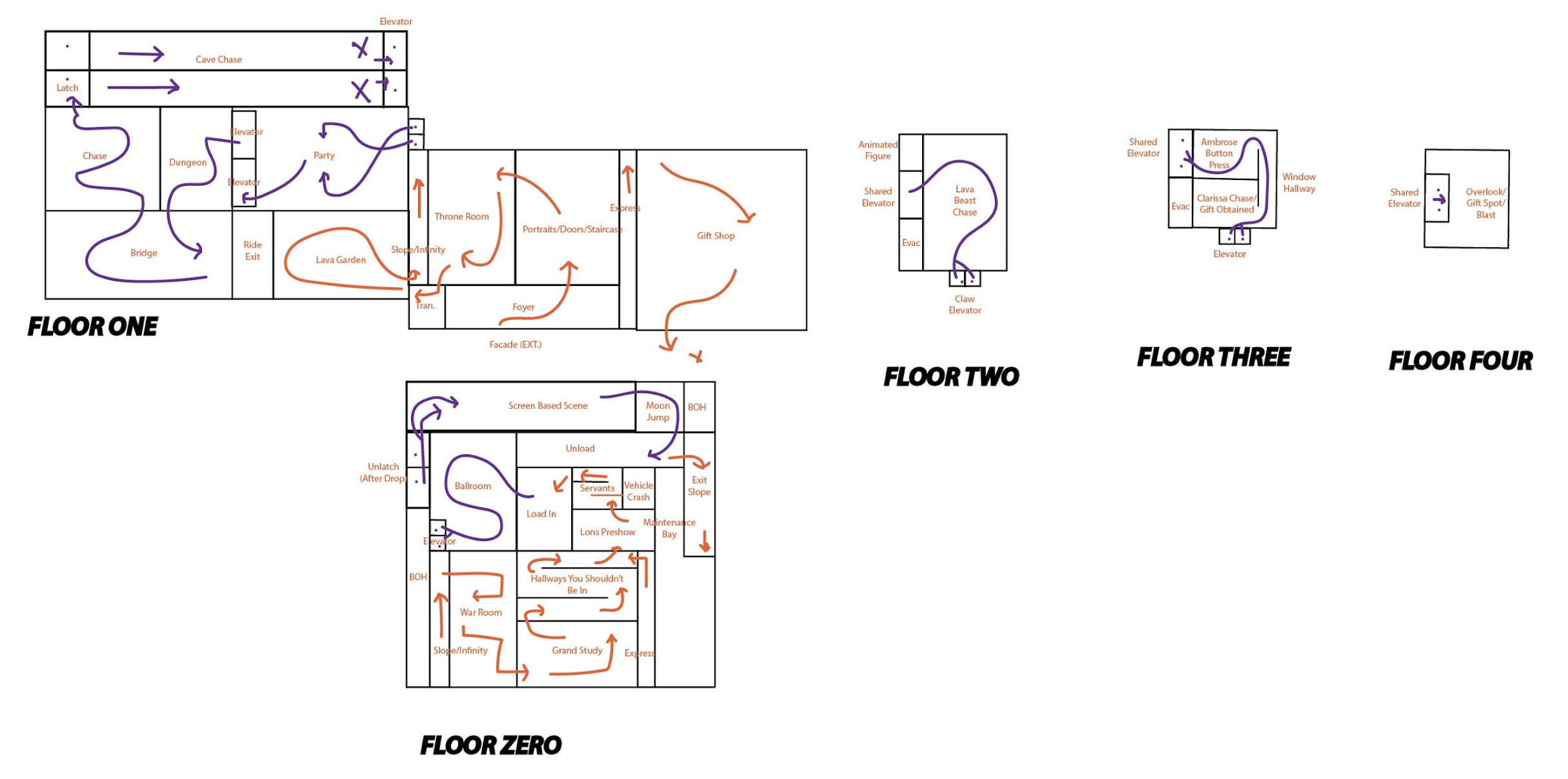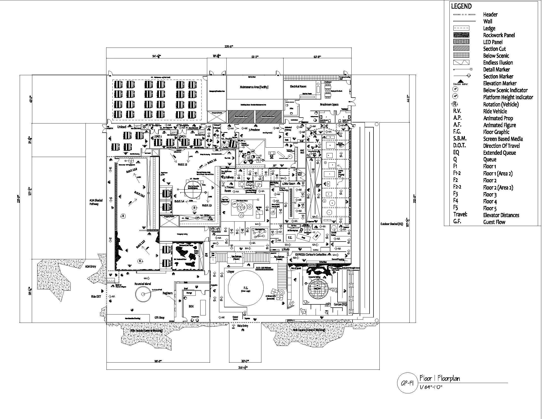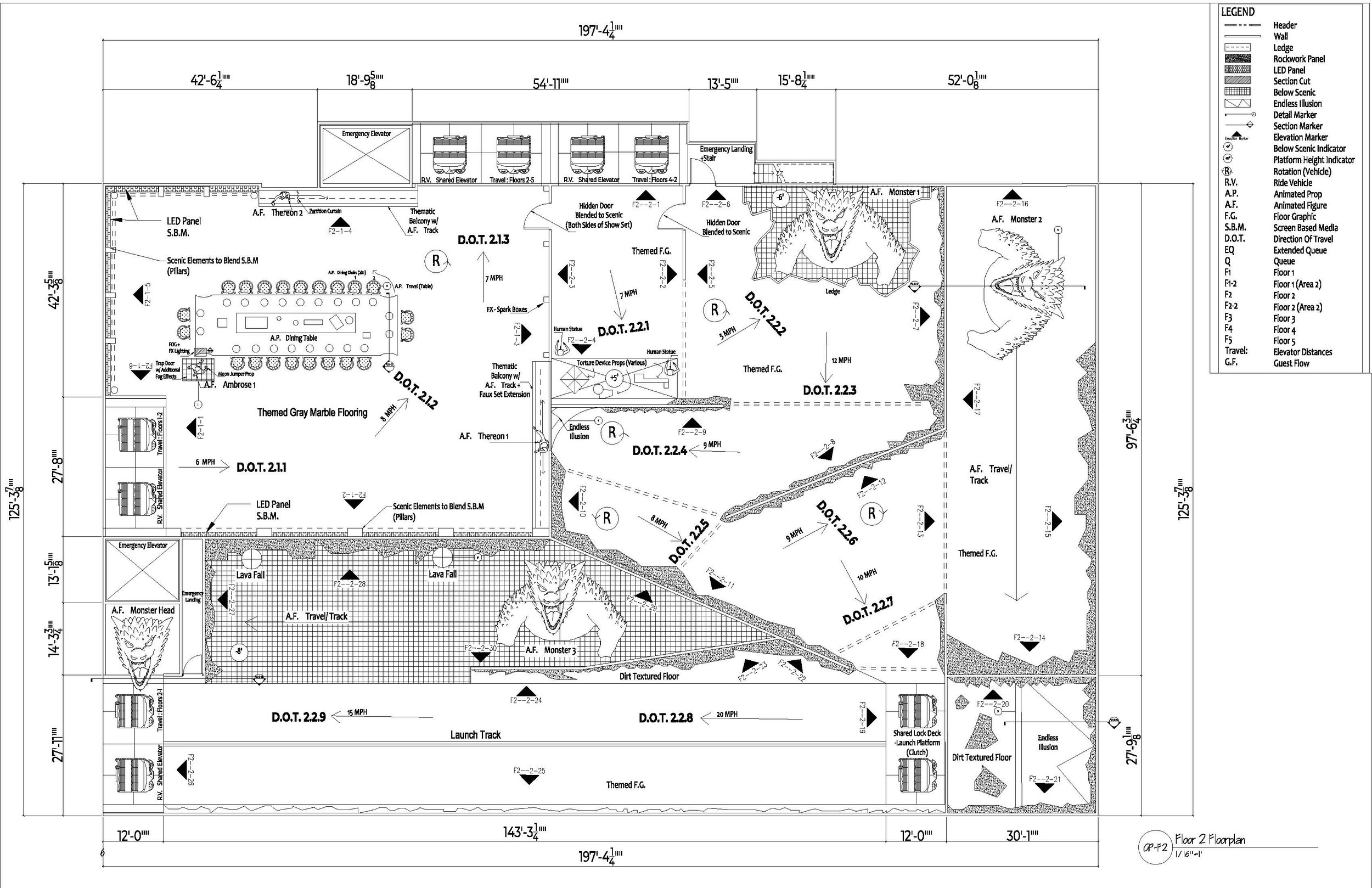A sample of ground plans created in AutoCAD for a theme park attraction centered around a lava planet fortress with oppressive rule and monsters. This project was in collaboration with an Entertainment Design class covering different areas of scope within the themed land.