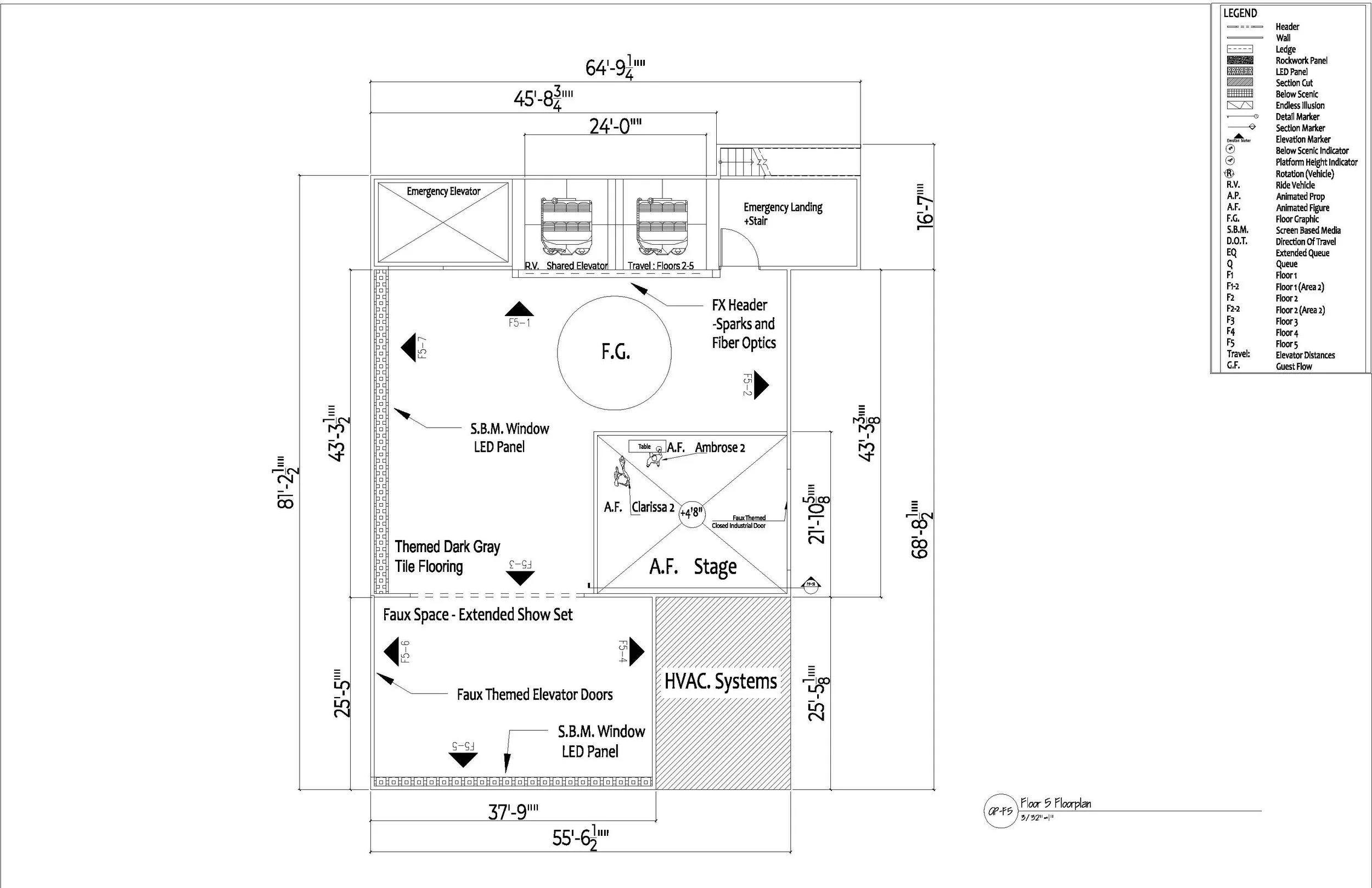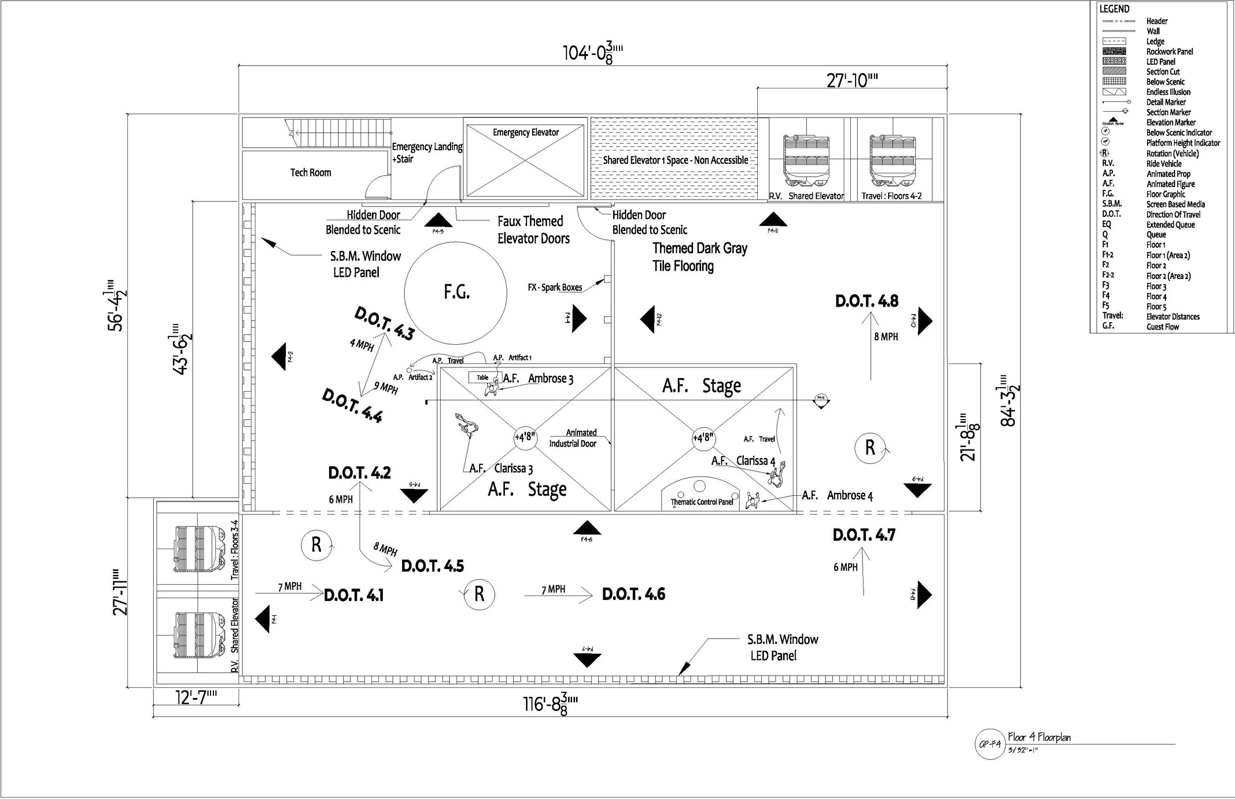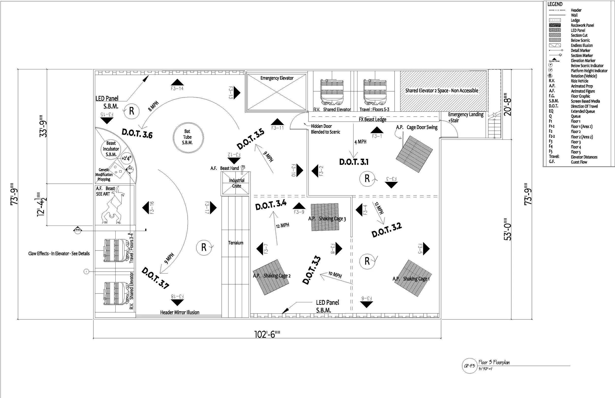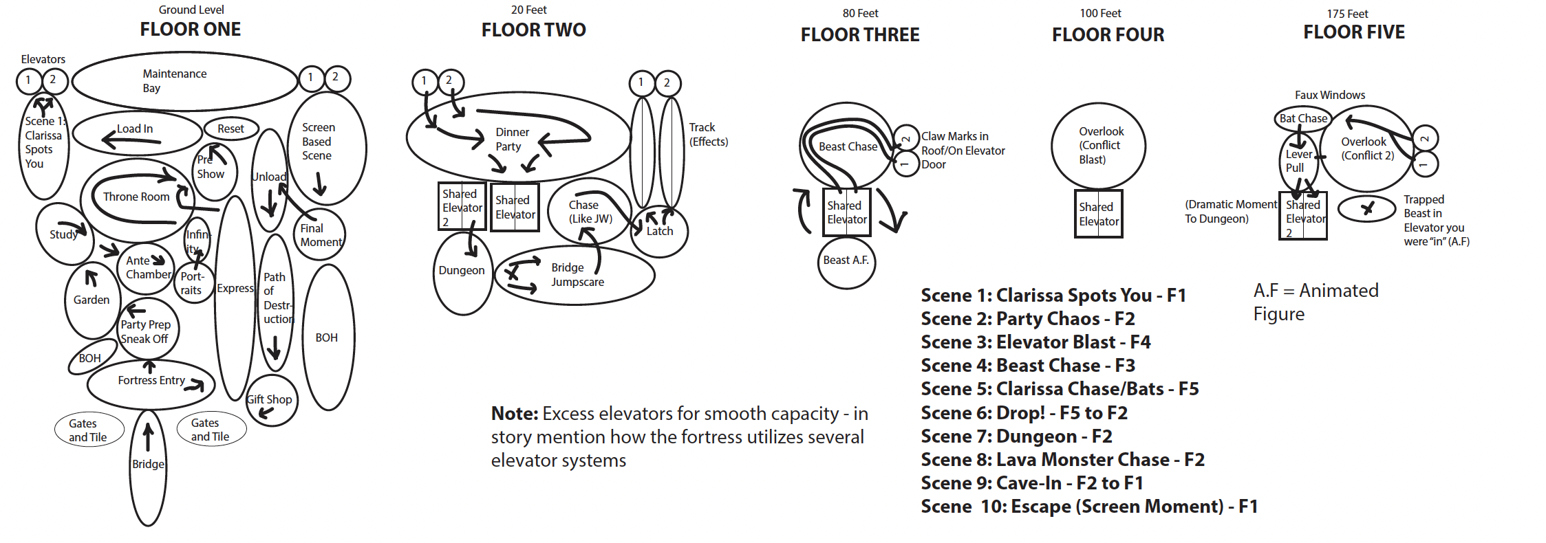 A sample of ground plans created in AutoCAD for a theme park attraction centered around a lava planet fortress with oppressive rule and monsters. This project was in collaboration with an Entertainment Design class covering different areas of scope within the themed land.